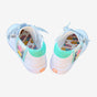• White PU leather upper; metallic silver leather accents, pink, salmon, and sea-foam blue leather star patches on the side; sea-foam blue leather heel grip