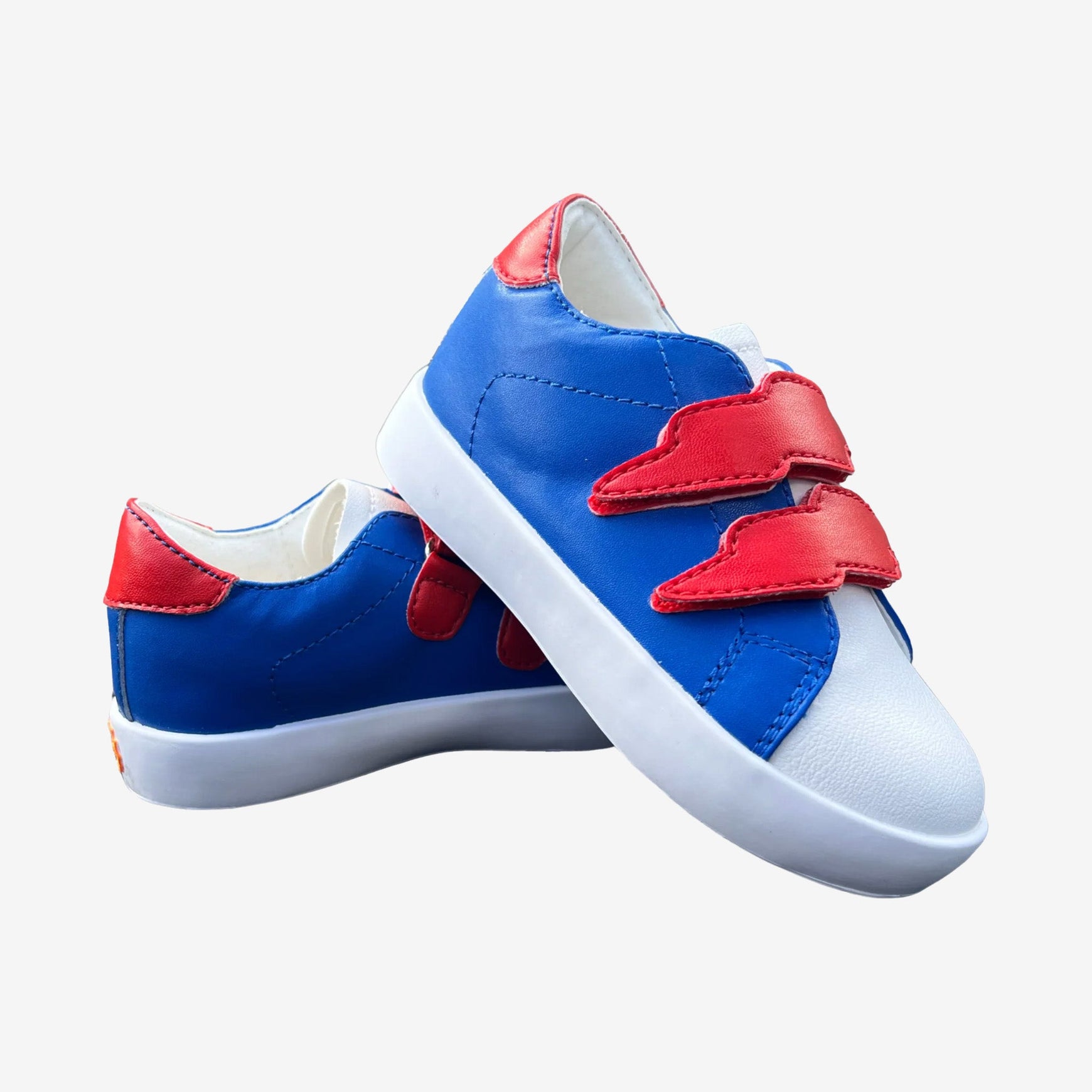 • Blue PU leather upper; Red leather cushioned heel grip; White leather tongue and toe• Dual red leather thunderbolt velcro straps for quick and easy on-and-off access• New branded soles and insolesAvailable in sizes EU 21 (Toddler 5-5.5) to 37 (Kids 5.5)