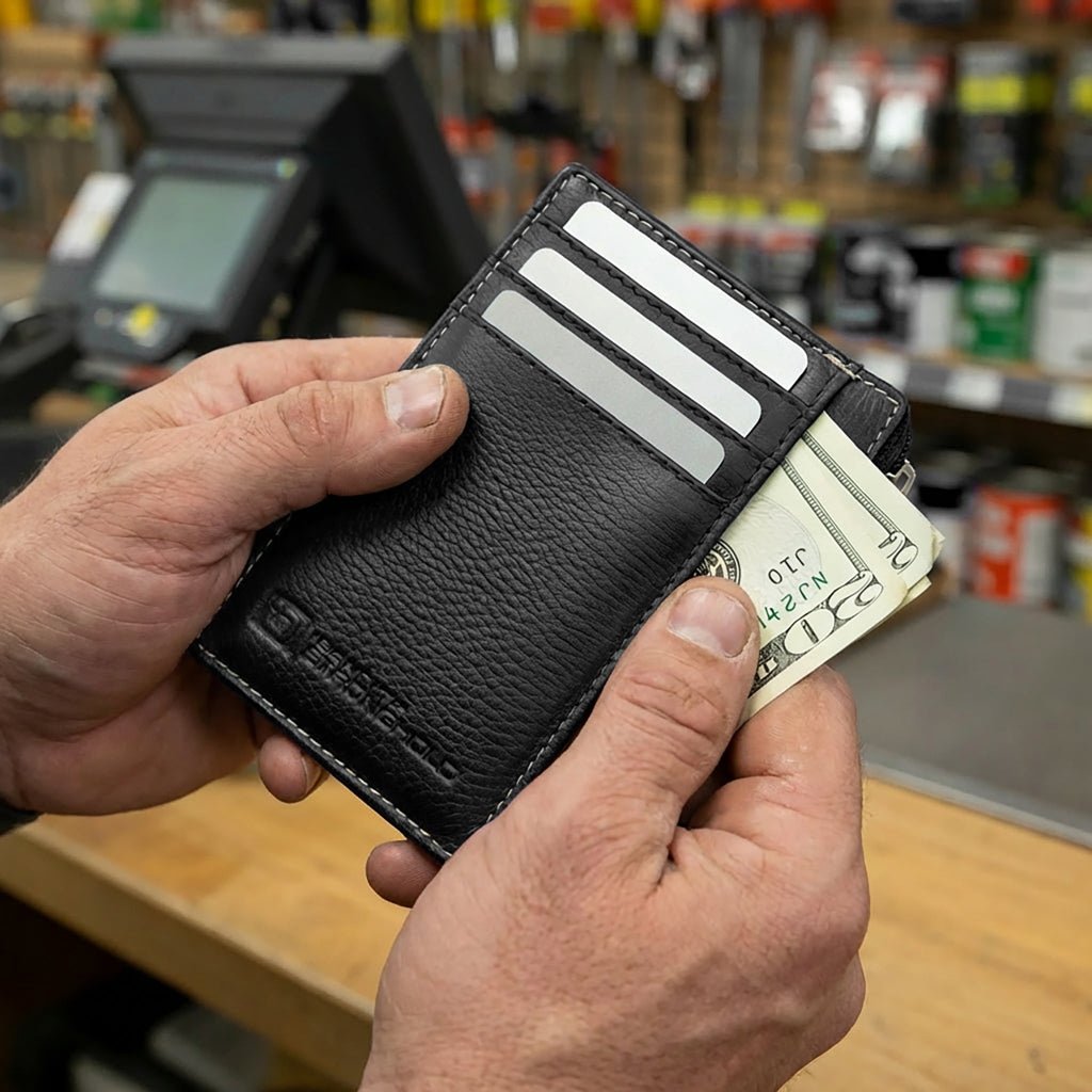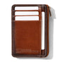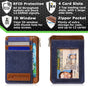 Crafted from premium genuine leather, this slim RFID wallet combines durability with a sleek, modern design. Despite its minimalist profile, it offers impressive organization, featuring four outer card slots, a clear ID window with thumb hole and magnetic closure, and a secure zippered compartment for extra cards, cash, or small essentials.